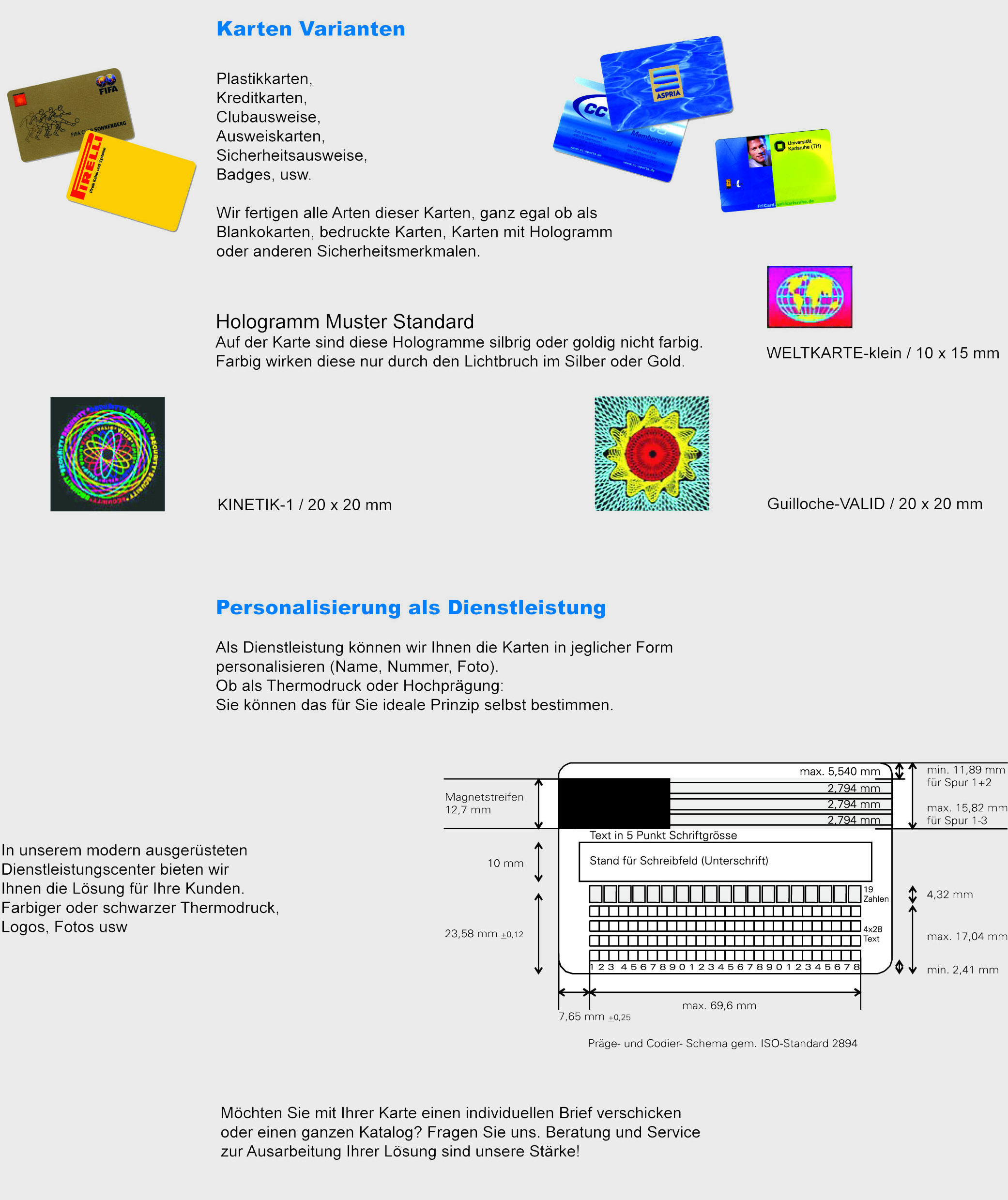 Wir fertigen alle genannten Karten, als Blankokarten, bedruckte Karten oder Karten mit Sicherheitsmerkmalen. Alle Karten können mit 3D-Hologrammen geschützt werden.